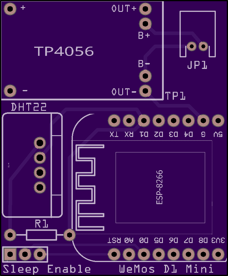 The requirement for battery was driven by the fact that there was nowhere nearby in the bathroom to plug the device in - and even if there had been, a long cord is ugly. This created an interesting constraint for the project. Thankfully, the ESP8266 supports a deep sleep mode which nearly shuts the device down and draws only tiny amounts of current. Being the lazy type, I bought the biggest LiPo battery within the budget (6500mAH) so it could go something like a year without needing to be charged. Mating the board and battery with the venerable DHT22 temperature/humidity sensor completed the critical hardware layout. To make recharging easier, I added a TP4056-based charging child board.